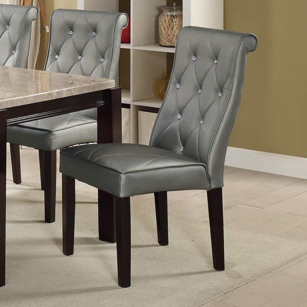 Dagonhil fabric dining/accent chairs (set of 2) with black solid wooden legs,nailed trim (gray). They are made with unique designs and finishes that make them compliment with most furniture sets. The contemporary design will accent any decor setting while offering the option to adjust to variable bar heights with ease. There is classic nail head trim around. Alfredo upholstered dining chairs grey and natural walnut (set of 2).